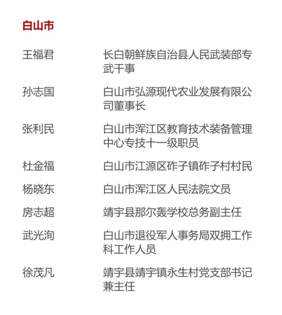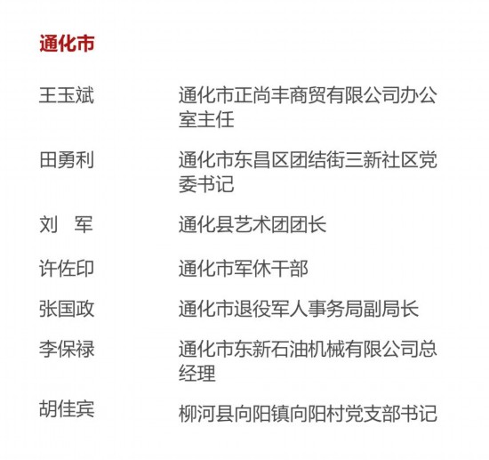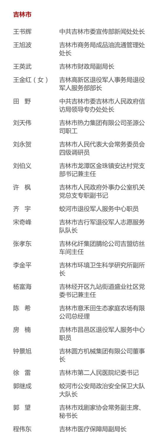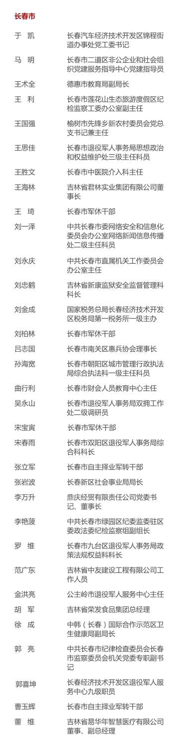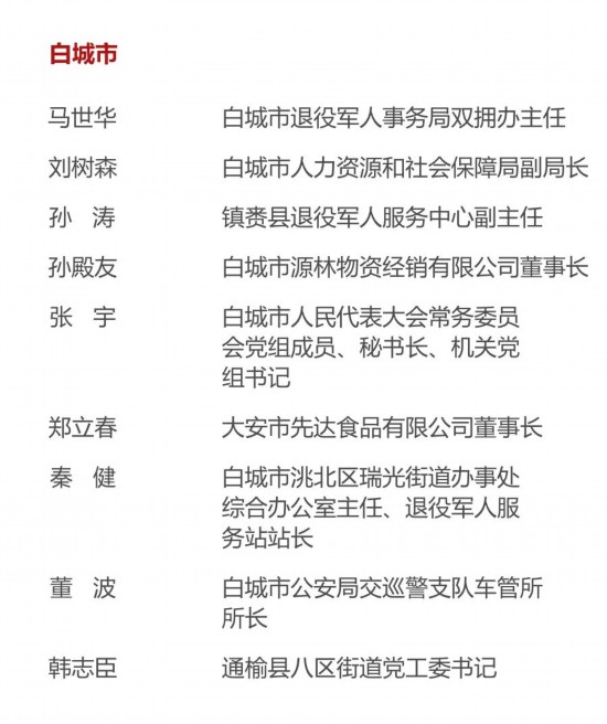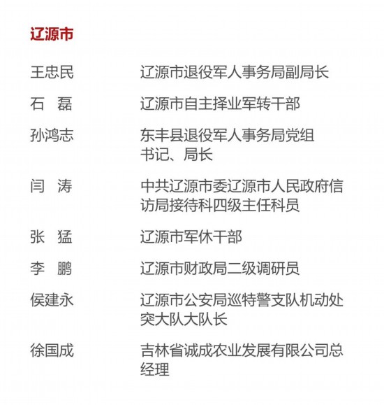 為深入貫徹落實習近平總書記關于退役軍人工作的重要論述,褒揚彰顯退役軍人為黨、國家和人民犧牲奉獻的高尚風范和價值導向,不斷增強退役軍人的自豪感、榮譽感、責任感,推動在全社會營造支持國防和軍隊建設,尊崇軍人職業,尊重退役軍人的濃厚氛圍,省委、省政府決定,授予孫海寬等150名同志“吉林省優秀退役軍人”稱號,長春市朝陽區退役軍人事務局等100個單位“吉林省退役軍人工作先進單位”稱號,韓雪等50名同志“吉林省退役軍人工作先進個人”稱號。希望受表彰的同志和單位珍惜榮譽、永葆本色,努力在新起點上再立新功。