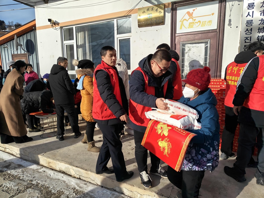 1月8日,和龍市“吉行軍”退役軍人志愿服務隊來到和龍市龍城鎮東南村,開展新春送溫暖志愿服務活動,為村民們贈送慰問品和祝福。