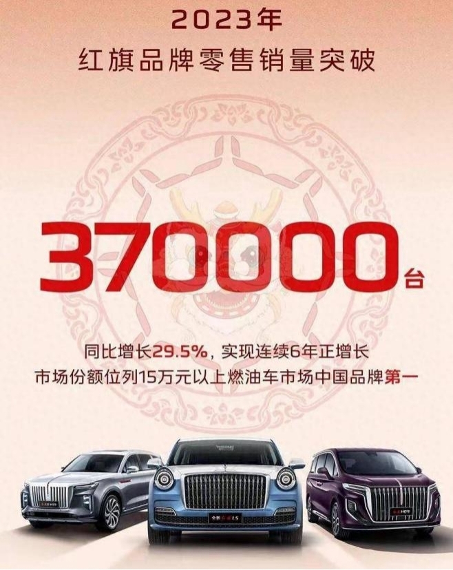 2023年,紅旗品牌零售銷量突破37萬臺,同比增長29.5%,連續6年實現正增長,市場份額位列15萬元以上燃油車市場中國品牌第一;新能源零售銷量突破85000臺,同比增長135%,新能源銷量滲透率23%,位列傳統豪華品牌第一,紅旗正不斷夯實國內汽車市場高端品牌領先位置。
