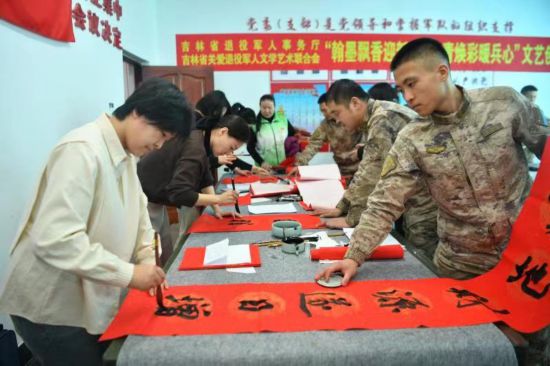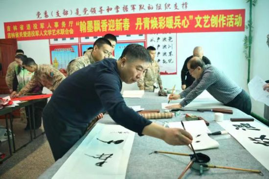 在文藝交流創作活動現場,吉林省書法家協會、吉林省關愛退役軍人文學藝術聯合會的文藝工作者們,有的潑墨揮毫,酣暢淋漓地書寫著一副副飽含對軍人職業尊崇之情的春聯;有的專心致志,精心描繪對新時代軍政軍民大團結頌揚之意的丹青彩繪?!芭醯ば谋M顯英雄本色、向未來書寫強軍新篇”“踔厲奮發專注練兵備戰、勇毅前行致力強軍興軍”等一幅幅描述新時代強軍興軍的書法、繪畫作品,飽含著文藝工作者們對人民子弟兵的尊崇和關愛之情,以藝術的形式展現了吉林省軍政軍民團結的大好局面。