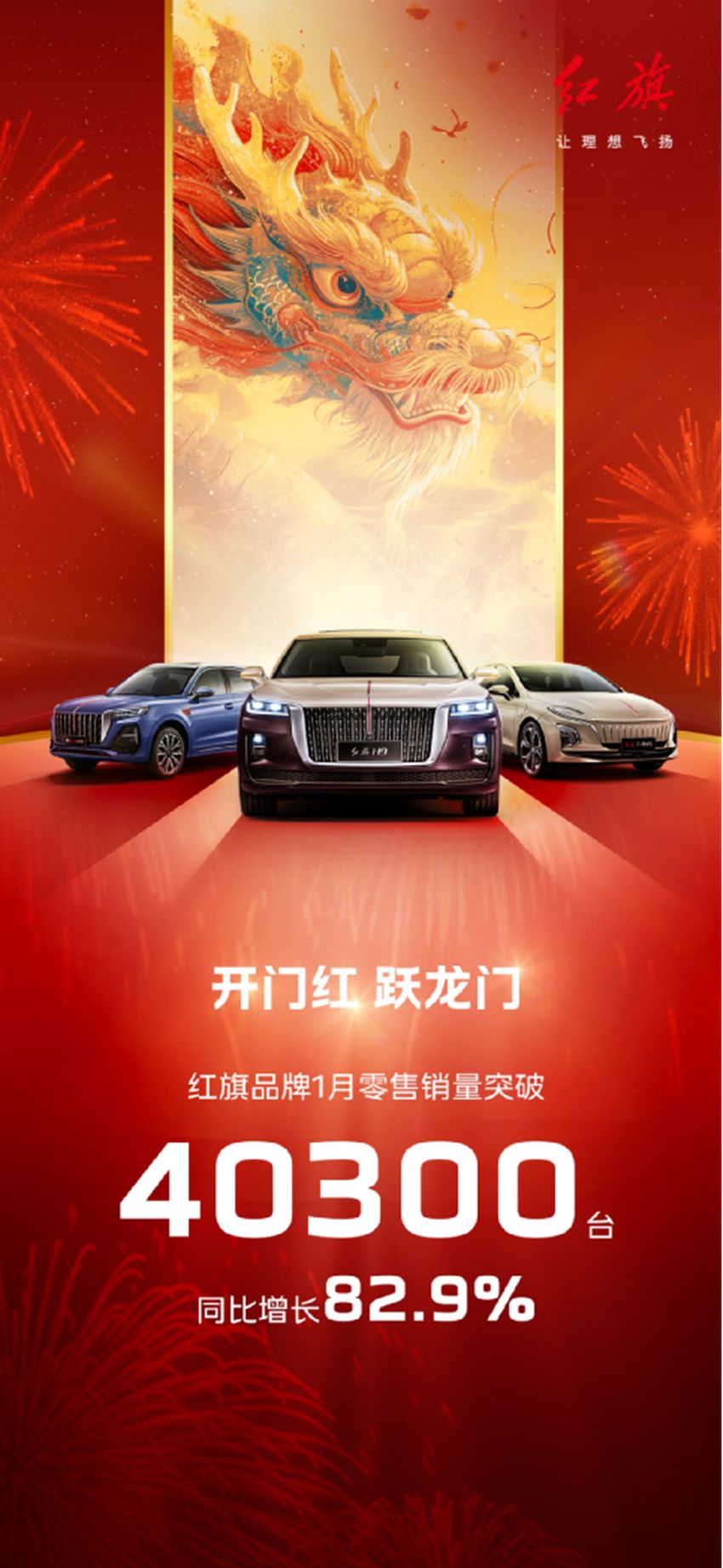 1月31日,一汽紅旗發布1月品牌銷量成績,1月零售銷量突破40300輛、同比增長82.9%,取得2024年銷量“開門紅”,可謂“旗躍龍門”、勢不可擋。