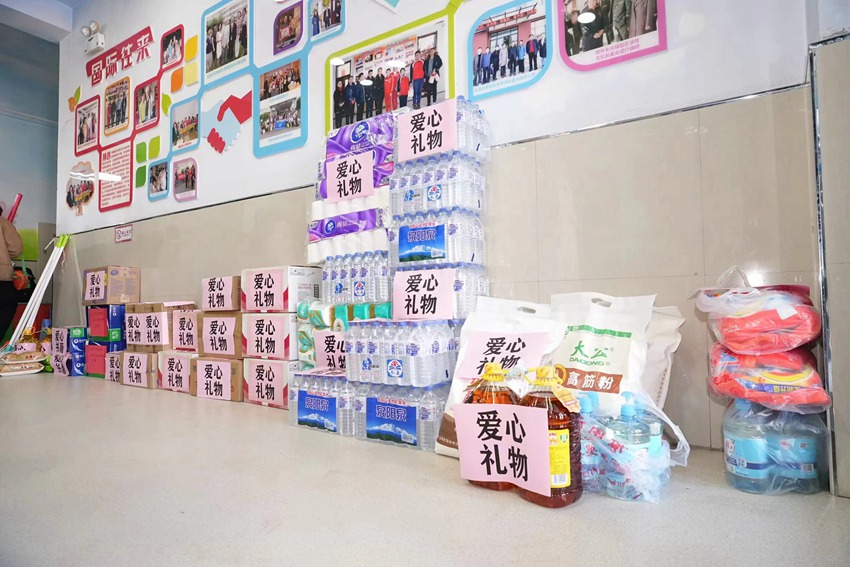 捐贈儀式上,志愿者向孩子們捐贈了圖書、文具等學習用品,以及礦泉水、豆油、面粉、卷紙、洗衣液等食品和生活用品。