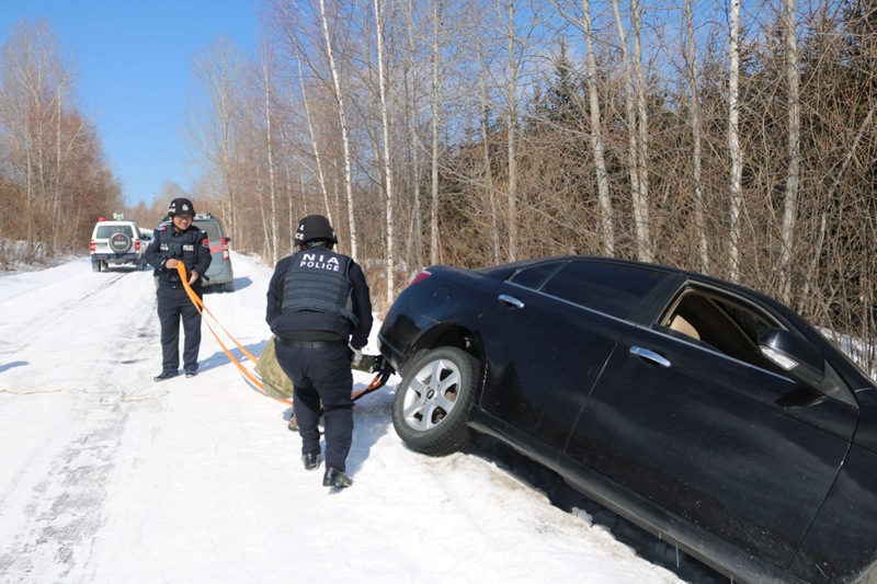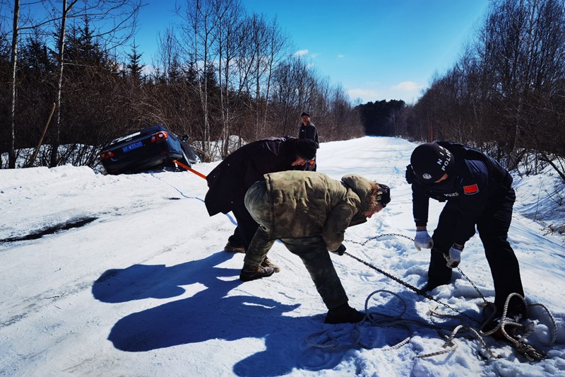 3月9日,白山邊境管理支隊龍崗邊境派出所接到群眾程某求助稱,因春季晝夜溫差大,道路多處結冰,其駕駛的車輛在轉彎時不慎滑入路邊被雪掩蓋的排水渠中,請求救援。接到求助后,派出所民警攜帶雪鍬、牽引繩等救援設備,迅速趕往現場開展救援工作。