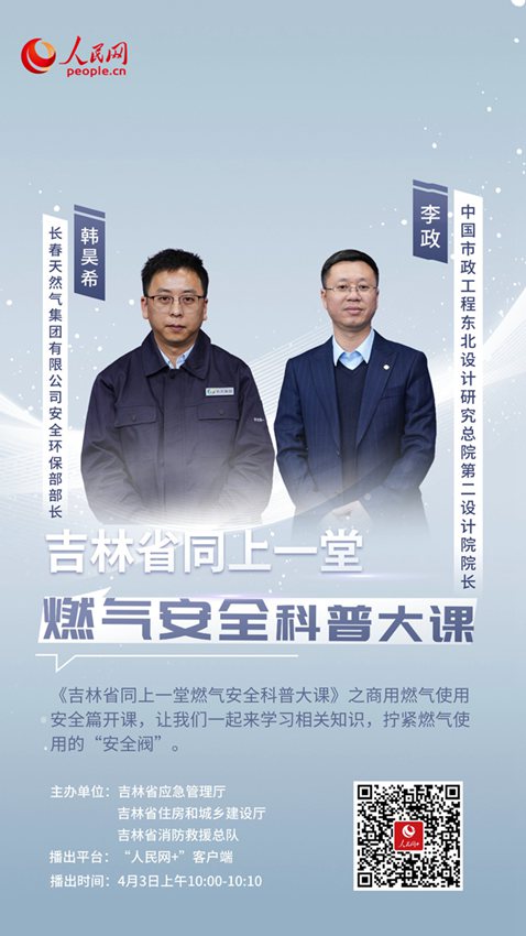 本次安全科普大課將由長春天然氣集團有限公司安全環保部部長韓昊希和中國市政工程東北設計研究總院第二設計院院長李政主講,網友可下載“人民網+”客戶端或關注人民網吉林抖音號收看。