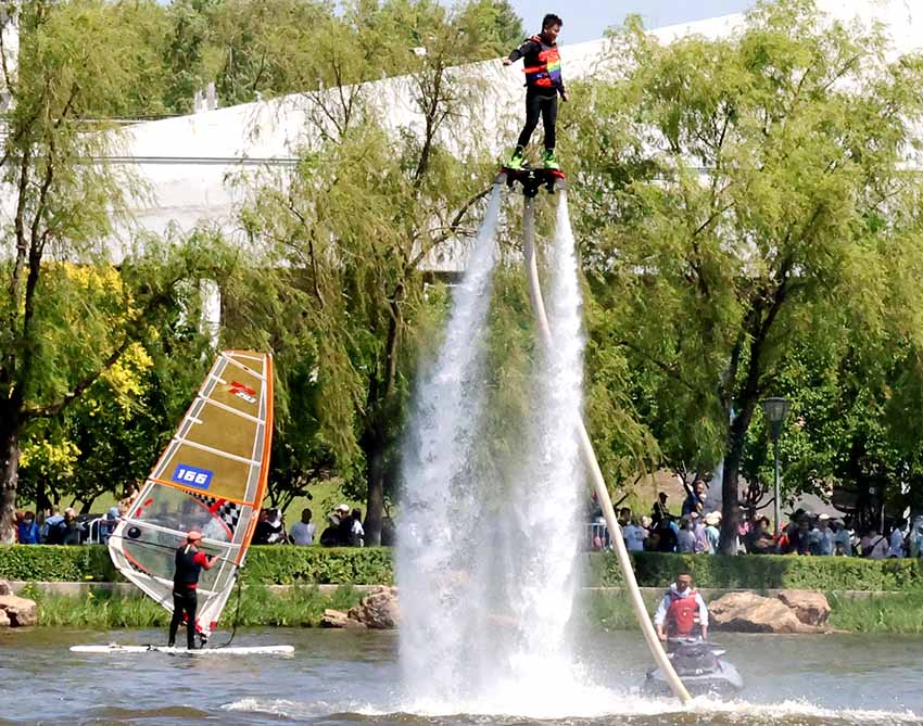 龍舟既是一項備受歡迎的傳統民俗活動,也是一項活力四射、昂揚向上的體育活動。在現場,除了精彩刺激的龍舟競賽,還有豐富多彩的全民健身展示和文化活動。全民健身活動展示覆蓋水上、陸上、空中,包括青少年OP帆船、帆板、摩托艇、水上飛人、槳板等項目。端午民俗體驗活動帶來五彩繩編織、香囊制作等,為市民提供了一場端午盛宴。