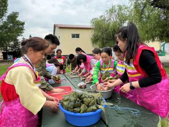 活動中,延邊山東商會向官兵送上慰問品,為活動增添了溫暖與關懷;延吉市虹星職業培訓學校校長現場示范并帶領大家系五彩繩,眾人齊心協力包粽子、搓五彩線,現場一片歡聲笑語;延吉市北山街道丹英社區退役軍人服務站工作人員為官兵們系上五彩線,表達美好祝福。全體人員共同唱響《軍中綠花》,將活動氛圍推向高潮。