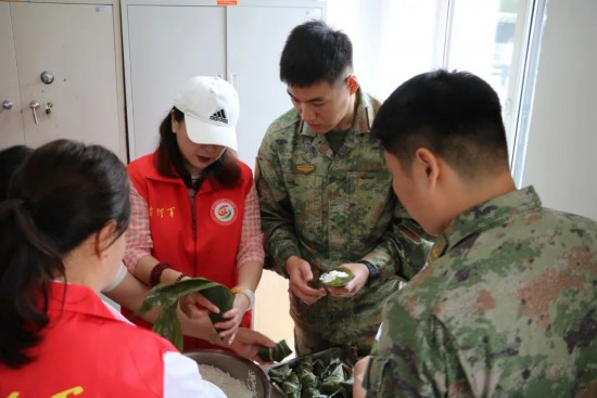 軍地人員共聚一堂,在“吉行軍”志愿者的帶領下,部隊官兵紛紛上手學習折粽葉、填糯米、纏粽繩,千姿百態的粽子呈現在眼前。大家一邊包粽子一邊聊天,現場氣氛輕松愉快,歡聲笑語熱鬧非凡。