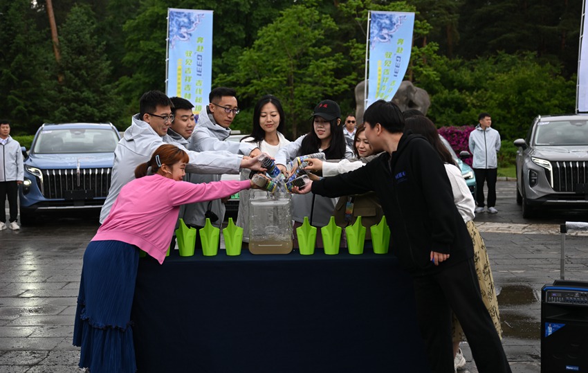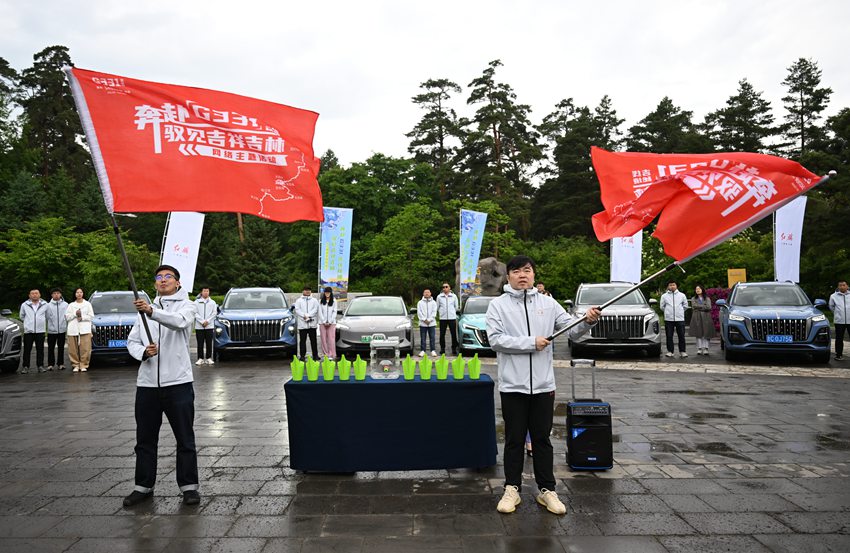 兩支車隊會師儀式上,各隊隊長手持隊旗并進行交換隊旗。隨后,南線車隊代表、北線車隊代表以及參加吉林省網絡名人座談會代表將在路上收集到的鴨綠江水、圖們江水、松花江水——三江之水緩緩倒入容器中,澆灌美人松公園的植被,象征著對吉林大地的滋養與祝福。