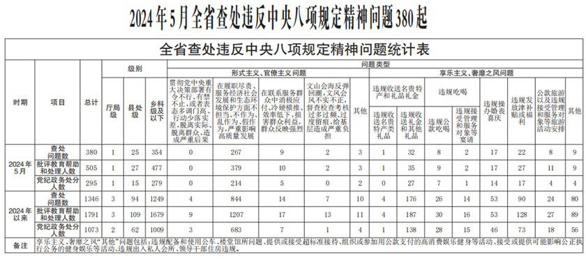 原標題:2024年5月全省查處違反中央八項規定精神問題380起