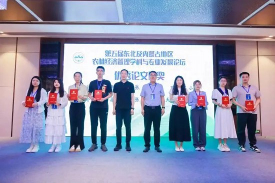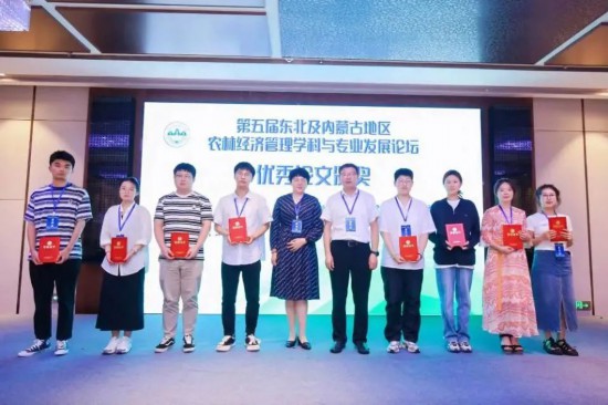 東北農業大學經濟管理學院院長余志剛教授(右五)、沈陽農業大學經濟管理學院院長周密教授(左五)為獲得優秀論文代表頒獎