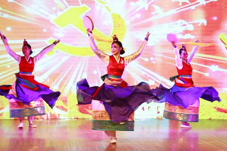 隨后,演出在圖們江合唱團帶來的大合唱《當那一天來臨》中拉開帷幕,歌曲《最美的歌兒獻給媽媽》《陽光路上》熱情謳歌了黨和祖國光輝燦爛的歷史成就和豐功偉績,表達了廣大民警心向祖國、扎根邊疆、竭誠為民的赤子之心和家國情懷?!盾岳蚧ā贰顿愸R》《建設場》三個節目分別用朝鮮族篳篥和二胡進行演繹,展現了演員們高超的樂器演奏技藝,贏得了現場觀眾陣陣掌聲,該站民警潘宏辰的歌曲《花開在眼前》更是把演出推向高潮,隨后舞蹈《響鈸舞》《長鼓情》《延邊人民熱愛毛主席》、獨唱《新延邊阿里郎》、小合唱《山楂樹》等節目輪番上陣,臺上激情四射,臺下熱情高漲,優美的樂聲,動感的舞蹈,不時贏來警民們的陣陣掌聲,大家的臉上都洋溢著幸福的微笑。一幅幅優美畫卷徐徐展開,一幕幕深情表演引人入勝,掌聲、歡呼聲響徹現場,最后一曲《歌唱祖國》音樂響起,臺上臺下集體放聲歌唱,嘹亮的歌聲讓人熱血沸騰,唱出了移民管理警察不忘初心跟黨走、牢記使命走在前的信心和決心。
