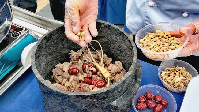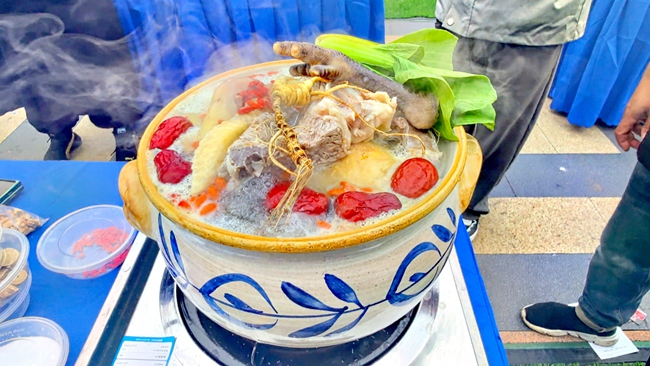 人參雞湯免費品鑒區內,現場群眾排隊等待,品嘗時亦交口稱贊。美味的人參雞湯,色澤金黃,清香撲鼻。嘗一口,唇齒間蕩漾著難以言喻的鮮香美味,帶著清新淡雅的人參香氣,回味悠長。別具匠心的人參美食盛宴讓觀眾耳目一新。