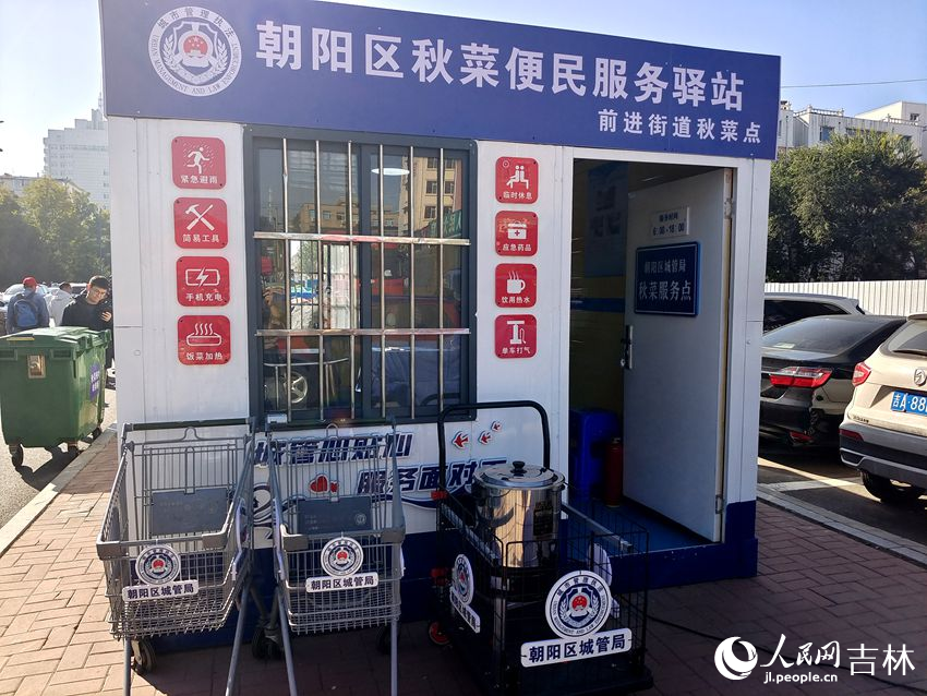 今年,長春市共設置120個秋菜點位,在每個點位都設置了城市管理便民服務亭。在具備條件的秋菜銷售點位設置了移動公廁,不具備條件的,由屬地城市管理部門與附近商家溝通免費對外開放廁所,并設置導示牌。便民服務亭為市民和菜農提供熱水、應急充電設備、常用醫藥品、維修工具、便民推車等。