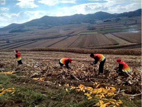在玉米地里,參加秋收的志愿者們分工有序,緊張忙碌,上了年紀的志愿者負責掰玉米,把零散的玉米收攏成堆,年輕的志愿者把一堆堆玉米裝袋,再手提、肩扛到地頭,還有幾個年輕力氣大的志愿者在地頭把一袋袋玉米裝車……勞作期間,志愿者們手和胳膊被玉米葉劃出一道道血痕,但大家熱情不減、干勁不松,直至完成預期秋收任務。