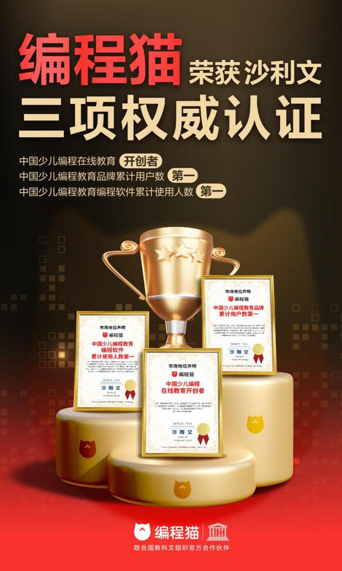 近日,全球頂尖研究及咨詢機構弗若斯特沙利文(Frost & Sullivan)授予編程貓“中國少兒編程在線教育開創者”“中國少兒編程教育品牌累計用戶數第一”“中國少兒編程教育編程軟件累計使用人數第一”三項市場地位聲明書。