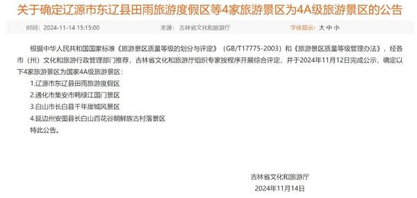 11月14日,吉林省文化和旅游廳發布公告,確定4家旅游景區為國家4A級旅游景區,分別是:遼源市東遼縣田雨旅游度假區、通化市集安市鴨綠江國門景區、白山市長白縣千年崖城風景區、延邊州安圖縣長白山百花谷朝鮮族古村落景區。