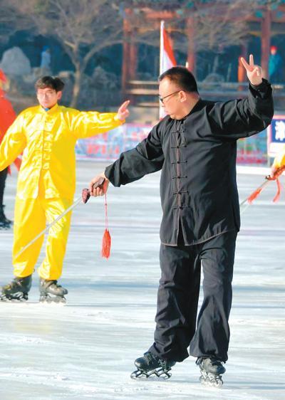 劉曉毅(右)表演冰上太極劍。