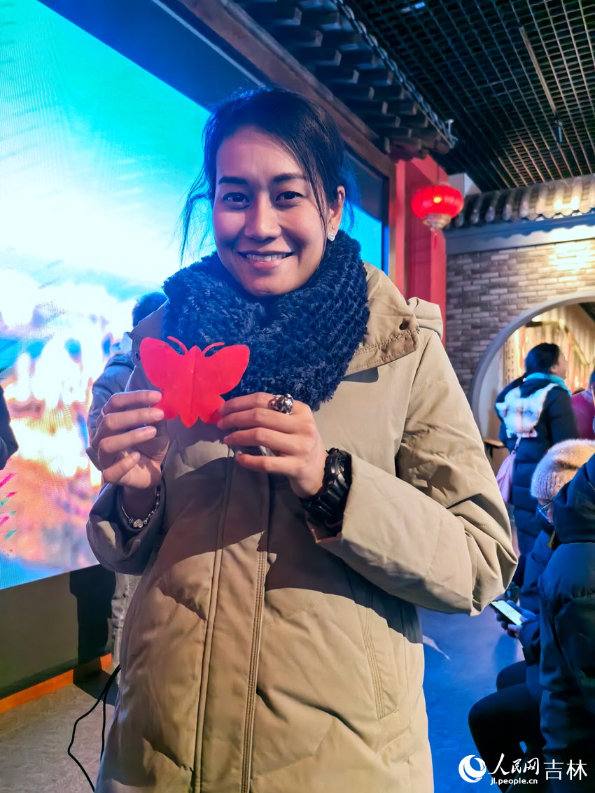 “我們先將正方形紙張對折一下,然后畫出蝴蝶的半邊線條,按照線條用剪刀裁剪……”在吉林市博物館非遺展覽現場,滿族剪紙技藝老師在教外國記者朋友剪紙。跟著老師一步步操作,來自泰國的一位記者親手剪出了一只蝴蝶:“老師說剪刀不動,一點點轉動紙,不一會兒,一只蝴蝶從我的手中誕生了,這種技藝真了不起?!?/p>