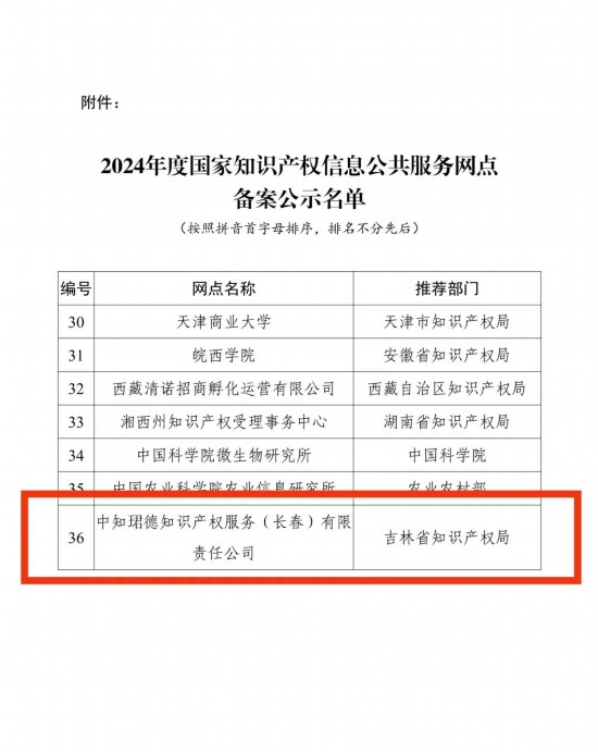 近日,國家知識產權局正式公示“2024年度國家知識產權信息公共服務網點備案名單”,全國共有36家單位入圍,其中,長春新區企業中知珺德知識產權服務(長春)有限責任公司為吉林省本批次唯一入選機構,也是吉林省首家獲批國家知識產權信息公共服務網點的民營企業。