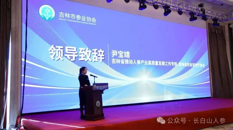 尹寶靖受吉林省人參專班委托,向吉林市參業協會的成立表示熱烈祝賀!同時,分析總結了吉林市作為吉林長白山人參的核心產區,發展人參種植存在巨大潛力,并具備濃厚的人參文化底蘊。域內還有諸如吉林博大農林生物科技有限公司、長白山制藥股份有限公司、吉林雪記中藥飲片有限公司等一批好的企業。她表示:省人參工作專班將滿懷“參”情厚誼,與吉林市參業協會并肩前行,向“參”發展,共同推動全省人參產業實現新的、更高水平的跨越式發展。