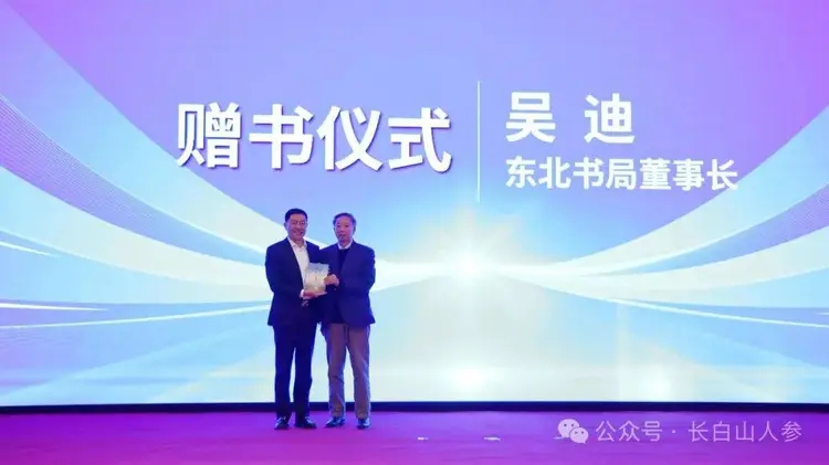 東北書局董事長吳迪向吉林市參業協會及與會人員,贈送由榮獲“人民英雄”國家榮譽稱號的中國工程院院士張伯禮領銜主編的人參專著《認識人參 科學使用人參》。