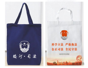 將《憲法》《民法典》宣傳標語融入設計之中,制成面巾紙、雨傘、環保帆布袋等日用品。
