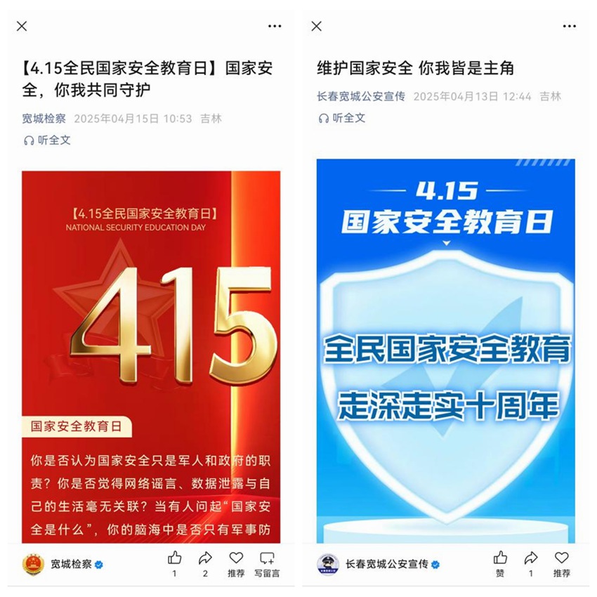 緊抓網絡宣傳不停歇。充分發揮網絡社群信息傳播優勢,增強法治宣傳廣泛性、即時性。全區各街鎮依托社區(村)居民微信群分享國家安全法小知識,牢固樹立總體國家安全觀;“長春寬城公安宣傳”“寬城檢察”等新媒體推送《維護國家安全 你我皆是主角》《國家安全,你我共同守護》等推文,引導居民群眾從點滴做起為維護國家安全貢獻力量。