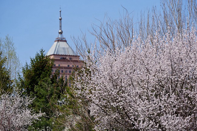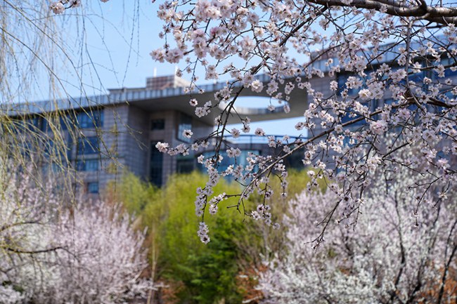 春日里吉大南嶺校園生機盎然,770米長的杏花大道上,254棵杏樹依次排列,一簇簇、一束束杏花白里透紅,競相吐蕊,形成了一道亮麗的風景線。