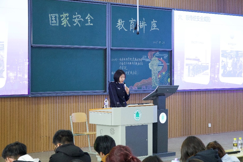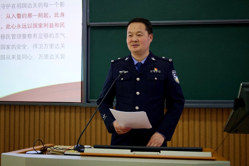 “我們每個人都希望每時每刻都陪伴在家人跟前,但我們移民管理警察更清楚國家好,小家才能好,戍邊衛國就是愛家護家”“國家安全沒有局外人,我們每個公民既是受益者,也是責任主體”……在宣講交流環節,李鵬以《厚植家國情懷,奏響時代華章》為題,用生動的語言、豐富的實例,講述了從古至今無數仁人志士的家國情懷故事,分享了移民管理警察遠離家鄉親人,戍守邊疆守護一方平安的家國情懷事跡,引導學生凝聚奮進力量,厚植青年學子家國情懷。韓婧以《國家安全——隱秘戰場的青春防線》為授課主題,通過案例講解、互動問答等形式,向學生們普及了政治安全、網絡安全、國土安全等國家安全知識,深刻闡釋國家安全體系的豐富內涵與實踐要求,引導師生深刻認識到國家安全與個人命運緊密相連,維護國家安全是每個公民的責任與義務。