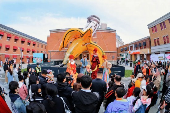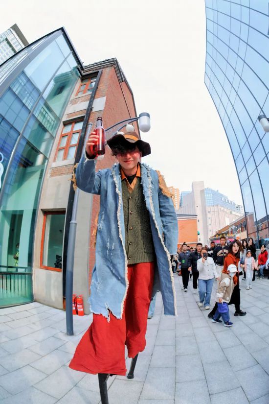街區一側,烏鎮戲劇節原班人馬帶來的高蹺巡游正熱鬧上演——2米多高的機械恐龍搖頭晃腦、“橫行霸道”地穿行于紅磚老巷,巨型《綠野仙蹤》鐵皮人踏著歡快的音樂與孩子們擊掌,踩著高蹺的“稻草人”則不停與大家揮手,隊伍里的火烈鳥輕輕啄了一下游客的手機,引得游客陣陣驚呼。
