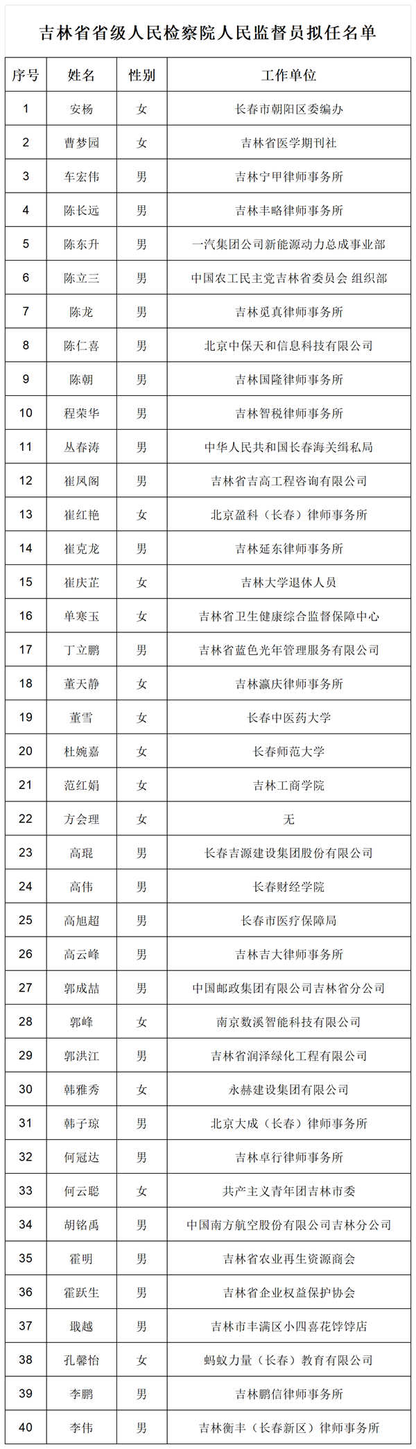 人民網長春5月26日電 據吉林省司法廳網站消息,吉林省根據最高人民檢察院、司法部《人民監督員選任管理辦法》規定,經審查,擬選任安楊等111名同志為吉林省第三屆省級人民檢察院人民監督員,現予以公示,公示時間為5月26日至5月30日。