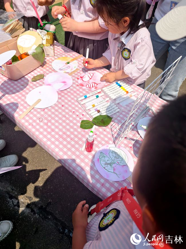 表演活動結束后,進入到親子趣享環節,長春市三園在園區內設置了8個特色區域探索打卡點,將傳統文化融入活動當中,包含扎染、活字印刷、非遺漆扇、皮影、泥塑等項目,孩子們帶著家長暢游園區,在打卡點完成相應任務,領取禮物。