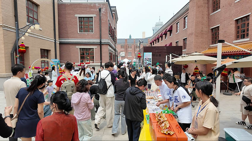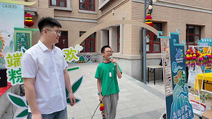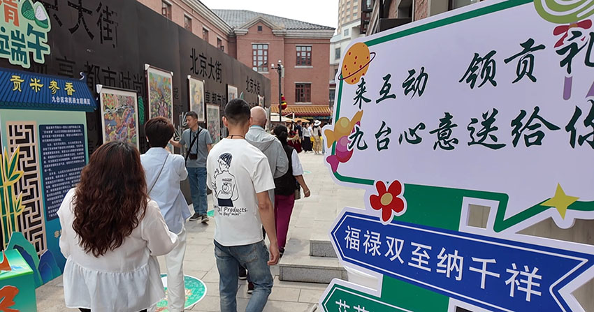 在游客互動區,主持人現場介紹九臺貢米和非遺相關知識,從中設置互動問答題目,游客每答對一道題即可獲得九臺貢米1罐及艾草1份,吸引了街區內大量游客前來駐足互動。在拍照打卡區,以“九臺萬象 春京共享”“端午‘童’歡 ‘粽’情六一”等為主題打造了適合大朋友、小朋友拍照打卡的背景墻,游客打卡分享后即可免費領取精品粽子1份。