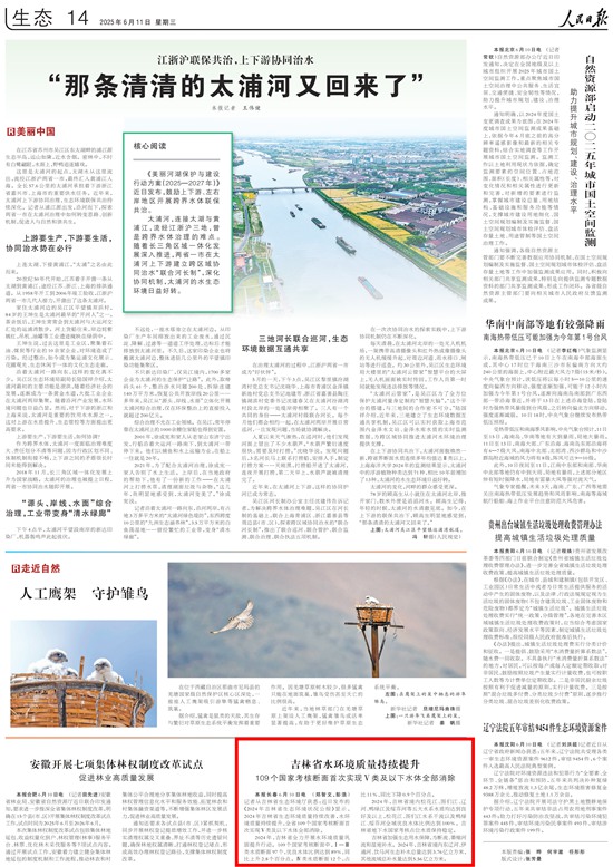 本報長春6月10日電 (鄭智文、彭浩)記者從吉林省生態環境廳獲悉:近日發布的《2024年吉林省生態環境狀況公報》顯示,2024年吉林省生態環境質量持續改善,水環境質量持續提升,全省109個國家考核斷面首次實現Ⅴ類及以下水體全部消除。