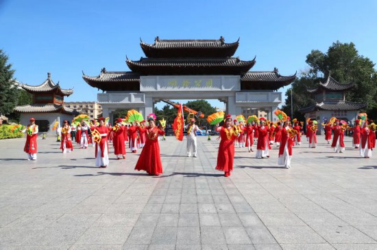 8時,公園里喇叭聲聲、鑼鼓陣陣,東三街道秧歌隊踏著歡快的鼓點、揮動著彩綢彩扇盡情舞動,隊形變化多樣,動作矯健流暢,彰顯了群眾昂揚向上的精神風貌,吸引眾多群眾駐足觀賞、連連叫好?!芭ぱ砀枋窃蹅兊膫鹘y民俗,現在融入了文明新風的元素,在文藝活動中寓教于樂,看著熱鬧又有意義?!眹^市民李琪笑著說。