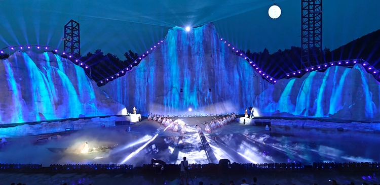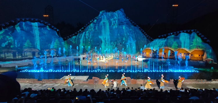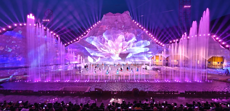 該項目以松樹和柏樹的愛情為“主線”,以朝鮮族和滿族兩個民族共同抵御水怪、建設美好家園的故事為“副線”進行展開。依托舞臺、假山與實景空間打造多層大視覺,形成區域光影聯動,實現虛擬與現實的結合,時間與空間的穿越,為觀眾帶來一場水舞交疊,山水相映的視覺盛宴,帶領游客開啟一場穿越長白山前世今生的光影之旅。