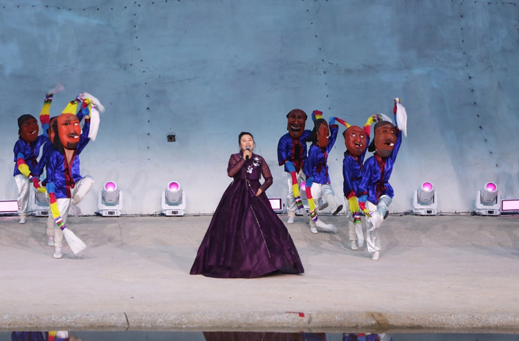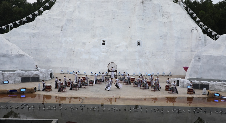隨著夜幕的降臨,長白山北坡國家森林公園月亮灣景區被點綴得燈火通明,一片璀璨。一場喜慶熱鬧的打擊樂表演《和諧之聲》率先登場,拉開了此次活動的序幕。儀式上,發布并授牌了“長白山一號”產品——“長白山一號”實景演出《長白戀歌》?!堕L白戀歌》項目由吉林長白山森工集團白河林業分公司謀劃建設,占地5525平方米,總投資約1.02億元,是東北三省首臺大型室外山水實景劇。