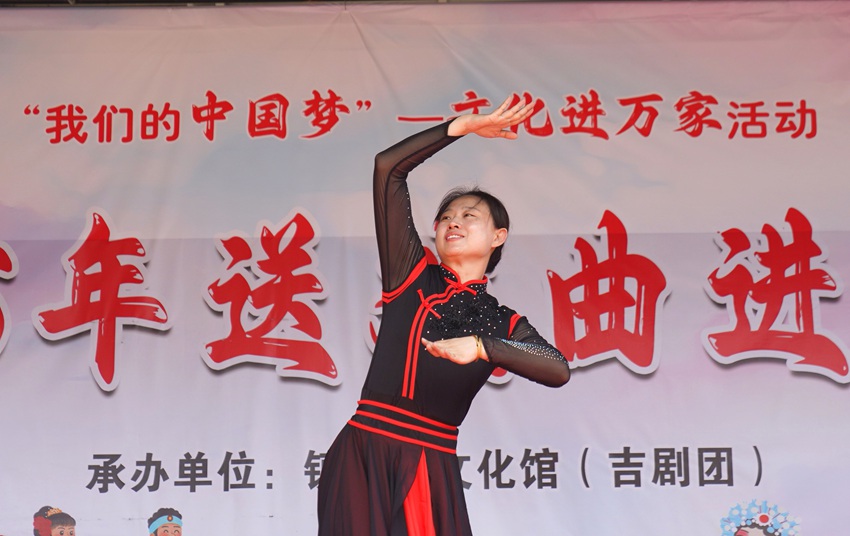 吉劇團演員郭靜的獨舞《莫尼山》堪稱視覺盛宴:她足尖輕點如踏云端,旋轉時裙擺揚起似山風掠過,將蒙古族長調的悠遠意境揉進肢體語言,站后排的蔣大娘都看得直抹眼淚:“在家門口看這么‘活’的演出,比電視里帶勁多了!”