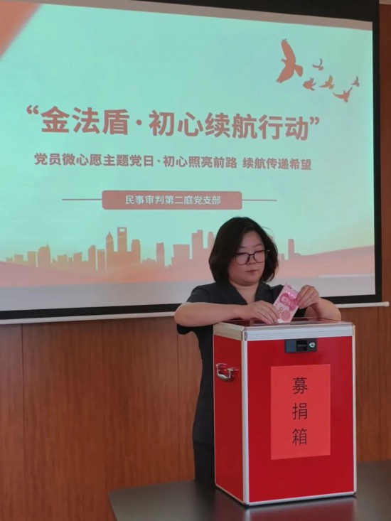 然而,常菁深知,案結了,事還沒了,這個家還需要實實在在的幫助。此時,民二庭與浦發銀行共建的“金法盾”黨建品牌,成為匯聚溫暖的樞紐。常菁主動聯系浦發銀行黨支部,聯合發起了一場名為“金法盾 暖冬行動”的愛心活動。在常菁的倡議下,黨員干警們紛紛伸出援手,自發為張某籌集孩子的醫療費和家庭基本生活保障金。