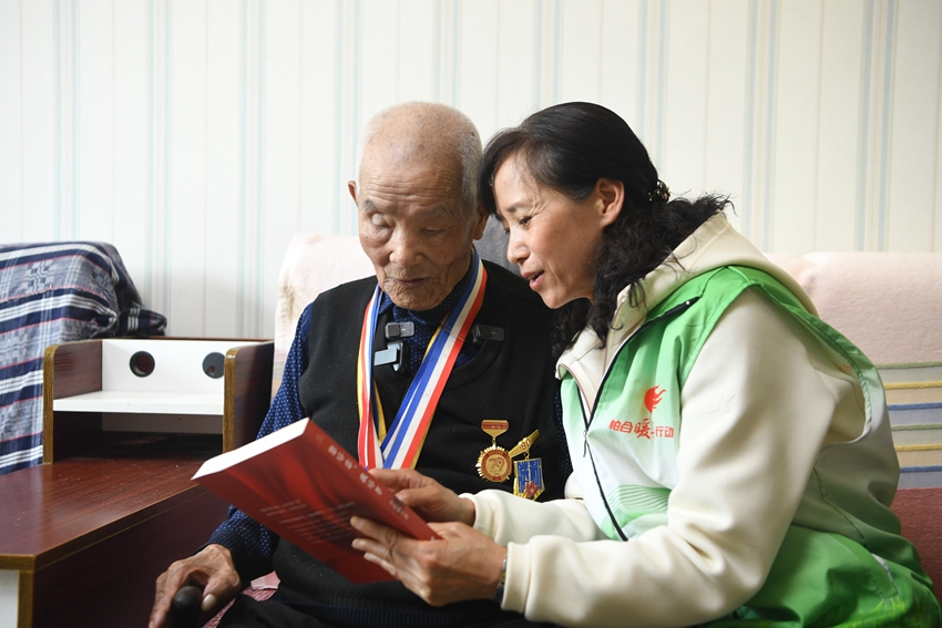 “正月里鬧元宵,金鞭繡開了,金鞭上繡的是領袖毛主席……”老人沙啞的嗓音里帶著鏗鏘。從《繡金匾》到《歌唱祖國》,他每天要唱紅歌?!耙郧霸诓筷爩W的,忘不掉?!边@些紅歌,是他對那段歲月的深情回憶。去年重陽節,社區慰問團來訪,98歲的他握著志愿者的手唱紅歌,最后一句“從今走向繁榮富強!”唱得熱淚盈眶。那一刻,他心中的愛國之情溢于言表。
