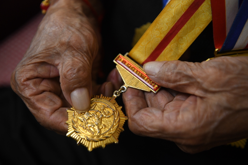 回憶起剛參軍時的場景,99歲的劉慶恩用盡全身的力氣說了一句日語,“繳槍不殺,送你回家”?!斑@句話,老爺子年輕的時候經常念叨,他說,說這句日語的時候,是他和戰友們最自豪的時候,因為那時候,是打了勝仗的時候!”劉慶恩親屬說。