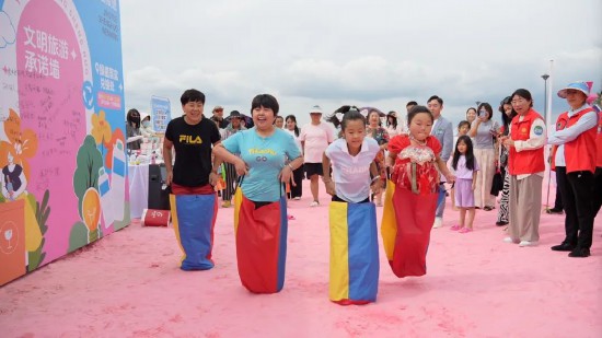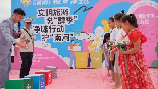 “文明旅行袋 躍動南河”游戲中,四名參與者套上特制的文明旅行袋,在沙灘上奮力跳躍,向著終點進發。他們的身影在陽光下充滿活力,引得周圍觀眾紛紛加油助威。一位參與游戲的市民笑著說:“這個游戲很有趣,在玩耍的過程中,也讓我更加深刻地記住了文明出游的理念,以后出游一定會帶走垃圾,做到無痕旅行?!?/p>