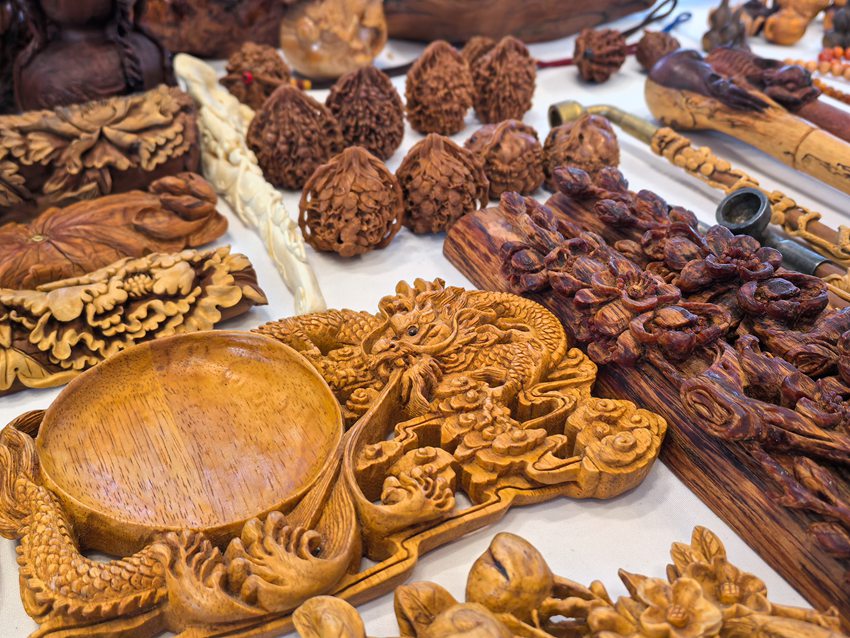 她的攤位上,有動物、人物等造型的木雕擺件,無不活靈活現;也有茶具、手鏈、項鏈、筆筒、發簪等實用性器具,琳瑯滿目。
