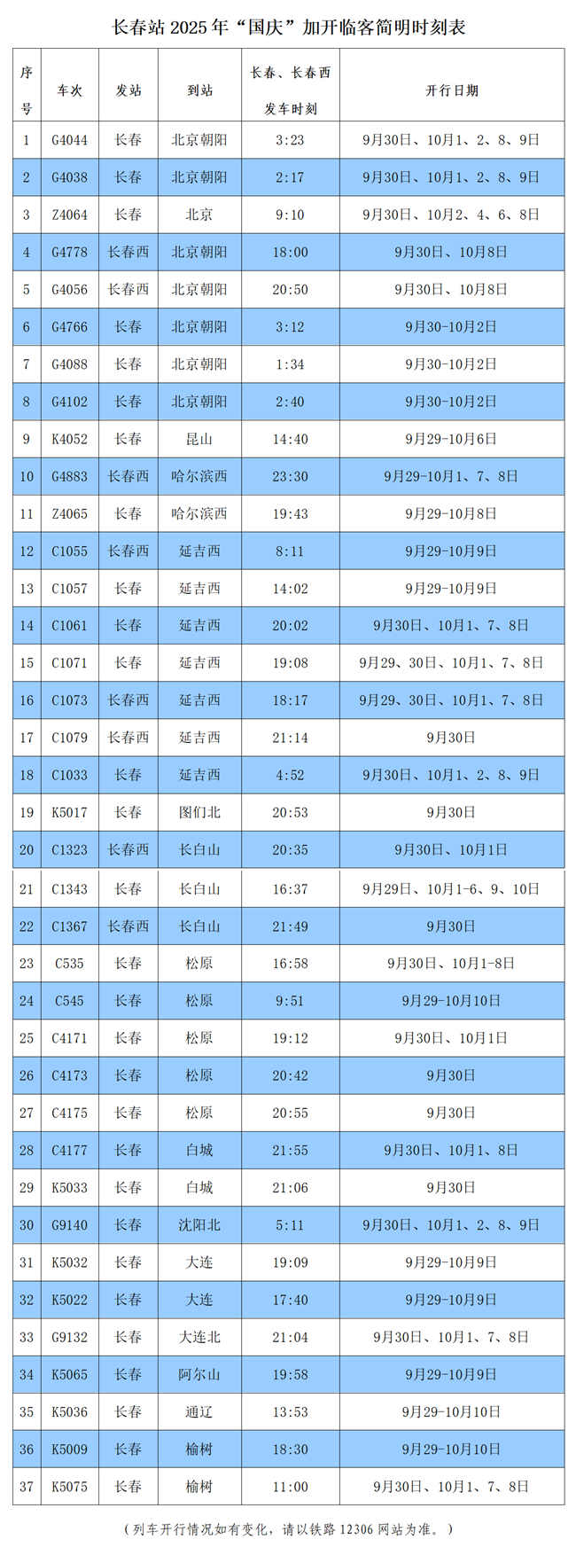 為保障旅客順利出行,長春站采取加開臨時旅客列車,動車組重聯、普速客車加掛等方式增加運能。節假日期間,車站共加開北京、大連、哈爾濱、延吉、白城等方向始發臨時旅客列車37列,最大限度滿足旅客出行需求。