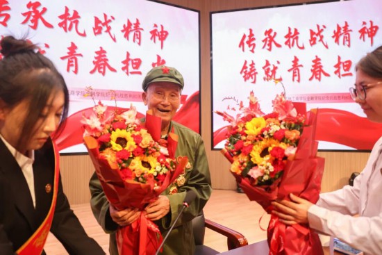 活動尾聲,知行廣場上出現了令人熱淚盈眶的一幕:金融學院金融學24501班退役大學生管延碩,向楊秀友老戰士敬上標準的軍禮;老人緩緩抬手,顫抖卻有力地回禮。兩代軍人,跨越70余年時光的敬禮,讓在場師生爆發出雷鳴般的掌聲。這不僅是軍人榮譽的傳遞,更是紅色精神的接力——老一輩用生命守護的信仰,正被青年一代穩穩接住。