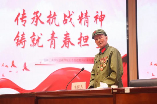 “雄赳赳,氣昂昂,跨過鴨綠江……”激昂的旋律在吉林工商學院博學樓A區117報告廳內回蕩,94歲的抗美援朝老戰士楊秀友緩緩站定。他的脊背雖不復當年挺拔,沙啞的嗓音卻裹挾著穿透歲月的力量,將這首鐫刻著烽火記憶的軍歌,唱進在場每一個人的心里。9月26日上午,數百名金融學院師生自發起身,指尖跟著旋律輕打節拍,輕聲合唱與熱烈掌聲交織,時光仿佛在這一刻折疊——年輕的面龐與戰火中的青春隔空相望,一段厚重的歷史,以最動人的方式完成了跨越時空的對話。