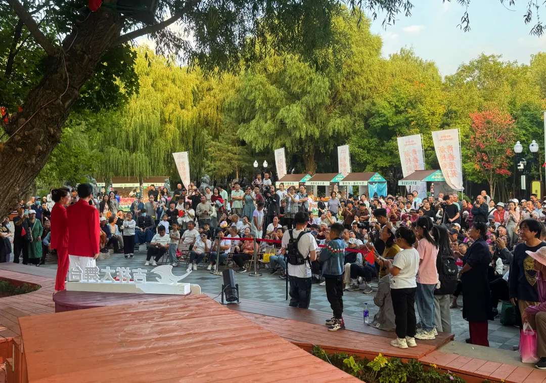 金秋時節,長春德苑內笑語盈盈?!敖鹎锼渡罴尽迸c國慶中秋雙節相遇,為市民游客帶來一場持續不斷的文化盛宴。竹筏在水面緩緩穿行,岸邊的市集人頭攢動,非遺手工藝攤位前圍滿了駐足觀看的游客。而在園區的“吉祥大舞臺”前,早已坐滿了等待觀看二人轉演出的觀眾?!拔覀儚脑缟暇劈c就來了,這里能吃能逛又能玩,活動非常豐富,現在正好坐下來看看二人轉演出?!奔易〕枀^的李先生一邊給家人分發剛買的美食,一邊笑著說,“孩子玩得盡興,老人看得開心,一家人都能找到樂趣,很難得?!?/p>