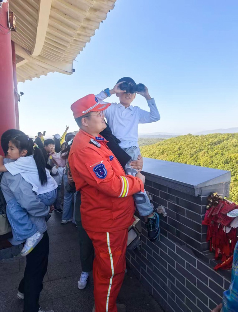 溫情故事在林間不斷上演。一位防火隊員正伸出手臂,為幾位游客指引遠方的風景,并詳細講解著景點的歷史和特色。他們目光所及,是吉林秋日的壯美山河和豐富文化。在觀景平臺,另一位防火隊員主動接過游客的手機,幫忙拍下與家人的珍貴合影,身后的警示牌“禁止倚靠”也成了無聲的安全提醒。還有一位防火隊員抱起一個小朋友,并把手中的望遠鏡遞給他,助力孩子“登高望遠”。更有幾位防火隊員為爆胎車輛,以最快速度更換了輪胎,得到了車主的連連稱贊。